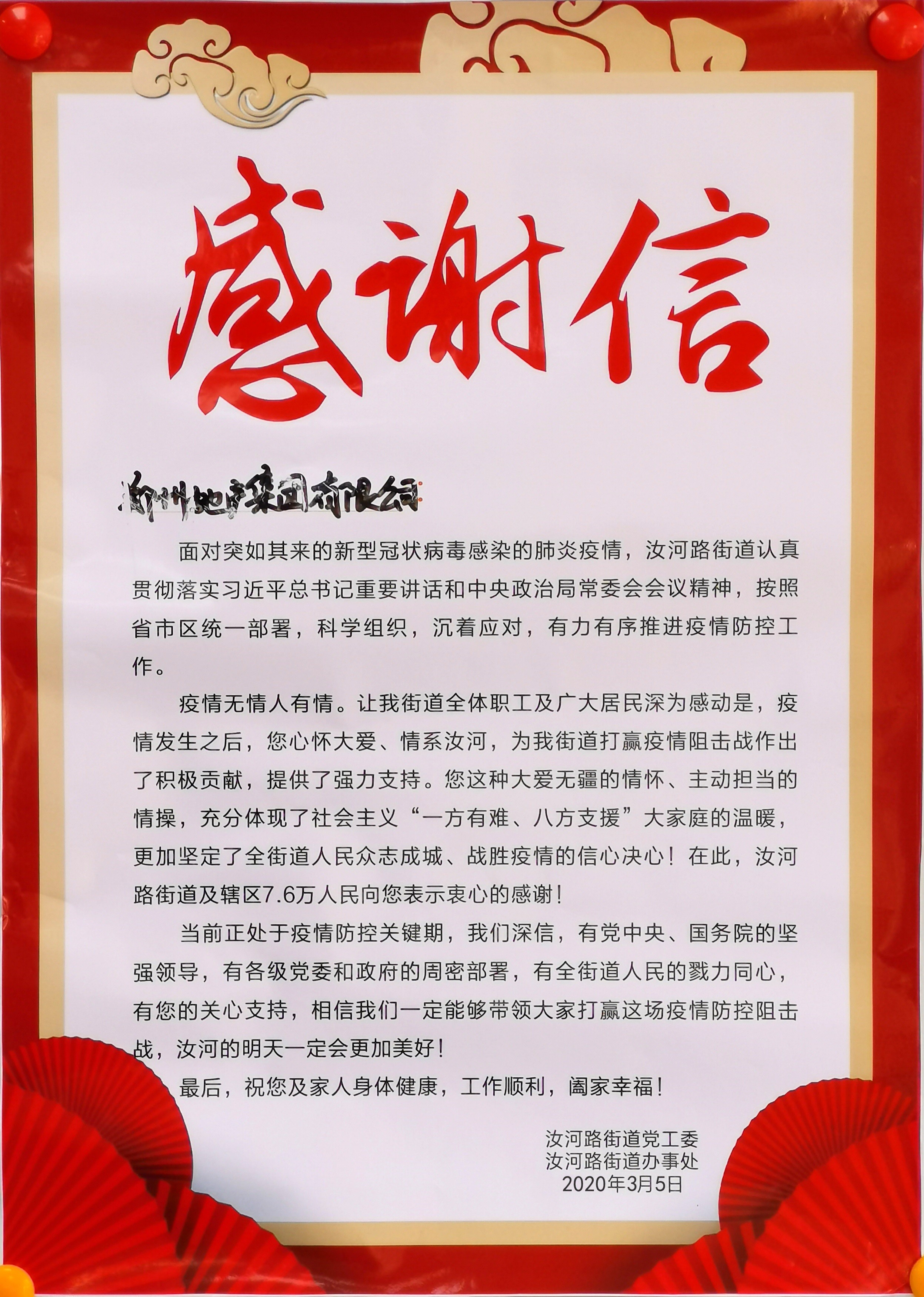 桐淮社區(qū)書記王輝代表社區(qū)工作人員和志愿者向集團(tuán)領(lǐng)導(dǎo)送上《感謝信》,并表示集團(tuán)的慰問讓一線工作人員心里充滿了溫暖,也進(jìn)一步堅定了開展疫情防控的信心和決心。在地產(chǎn)集團(tuán)等社會各界的關(guān)心關(guān)注下,在無數(shù)雷鋒式志愿者的共同努力下,我們一定會打贏新冠肺炎疫情防控這場硬仗。